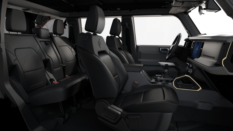 Equipment Group 332A Mid Package (2-Door Intelligent Access w/Lock/Unlock, Ambient Footwell Lighting, Connected Navigation, Dr & Pass Illuminated Sliding Visor Vanity Mirrors, Dual Smart Charging USB Ports, Dual-Zone Electronic Automatic Temperature Control, Front Row Heated Seats, Power Outlet - Back Side of Center Floor Console, and Rear Parking Sensors), 4-Wheel Disc Brakes, 4.7 Axle Ratio, 7 Speakers, ABS brakes, Air Conditioning, Alloy wheels, AM/FM radio: SiriusXM with 360L, AM/FM Stereo, Auto High-Beam Headlamps, Auto High-beam Headlights, Auto-dimming Rear-View mirror, BLIS Blind Spot Information System, Body Color-Painted Hard Top, Brake assist, Compass, Delay-off headlights, Door Storage Bags, Driver door bin, Driver vanity mirror, Dual front impact airbags, Dual front side impact airbags, Electronic Stability Control, Emergency communication system: 911 Assist, Exterior Parking Camera Rear, Front anti-roll bar, Front Bucket Seats, Front Center Armrest, Front fog lights, Front reading lights, Front wheel independent suspension, Fully automatic headlights, Hard Top Sound Deadening Headliner, Heated door mirrors, Heated front seats, Heated steering wheel, Illuminated entry, Integrated roll-over protection, Internet access capable: FordPass Connect, Lane-Keeping System, Leather Shift Knob, Low tire pressure warning, Marine Grade Vinyl Heated Bucket Seats, Occupant sensing airbag, Outside temperature display, Overhead airbag, Overhead console, Panic alarm, Passenger door bin, Passenger vanity mirror, Power door mirrors, Power steering, Power windows, Pre-Collision Assist w/Automatic Emergency Braking, Radio data system, Rear-View Camera, Rear-Window Defroster & Washer, Remote keyless entry, Security system, SiriusXM w/360L, Speed control, Split folding rear seat, Steering wheel mounted audio controls, SYNC 4, Tachometer, Telescoping steering wheel, Tilt steering wheel, Traction control, Trip computer, Variably intermittent wipers, Voltmeter, and Wheels: 17 Carbonized Gray-Painted Aluminum.