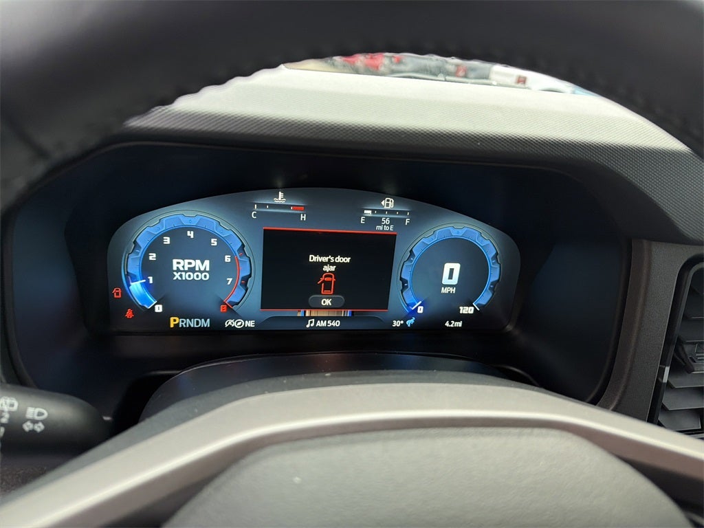 Equipment Group 221A Standard Package, 4-Wheel Disc Brakes, 4.46 Axle Ratio, 7 Speakers, ABS brakes, Air Conditioning, Alloy wheels, AM/FM radio: SiriusXM with 360L, AM/FM Stereo, Auto High-beam Headlights, Brake assist, Cloth Bucket Seats, Compass, Delay-off headlights, Driver door bin, Driver vanity mirror, Dual front impact airbags, Dual front side impact airbags, Electronic Stability Control, Emergency communication system: 911 Assist, Exterior Parking Camera Rear, Front anti-roll bar, Front Bucket Seats, Front Center Armrest, Front reading lights, Front wheel independent suspension, Fully automatic headlights, Heated door mirrors, Illuminated entry, Integrated roll-over protection, Internet access capable: FordPass Connect, Leather Shift Knob, Low tire pressure warning, Occupant sensing airbag, Outside temperature display, Overhead airbag, Overhead console, Panic alarm, Passenger door bin, Passenger vanity mirror, Power door mirrors, Power steering, Power windows, Radio data system, Remote keyless entry, Security system, SiriusXM w/360L, Speed control, Split folding rear seat, Steering wheel mounted audio controls, SYNC 4, Tachometer, Telescoping steering wheel, Tilt steering wheel, Traction control, Trip computer, Variably intermittent wipers, and Wheels: 17 Carbonized Gray-Painted Aluminum.