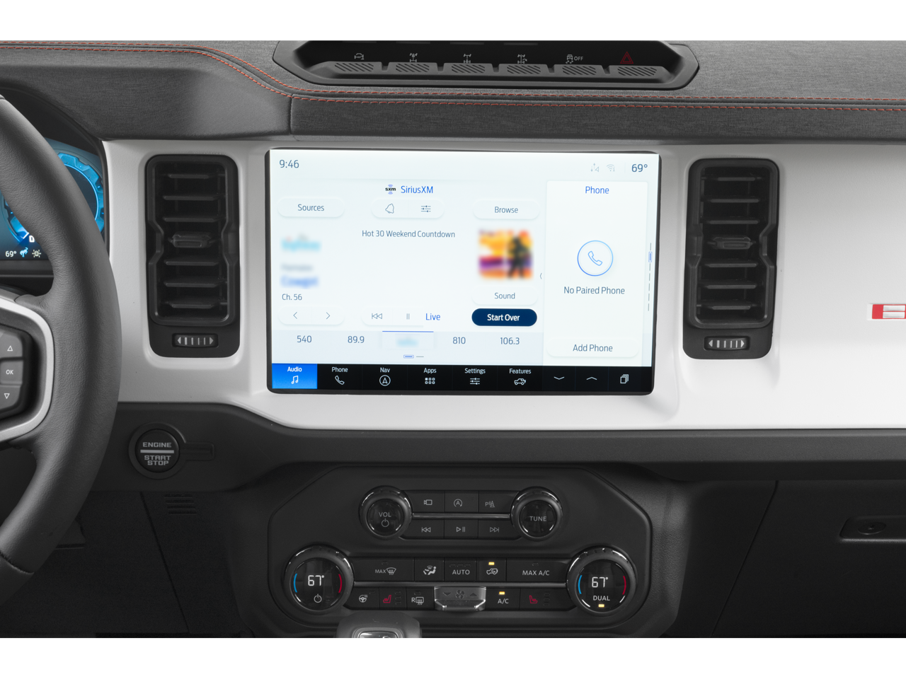 ABS brakes, Active Cruise Control, Alloy wheels, Compass, Electronic Stability Control, Front dual zone A/C, Heated door mirrors, Heated front seats, Illuminated entry, Low tire pressure warning, Navigation System, Remote keyless entry, Traction control, 12 Speakers, 4-Wheel Disc Brakes, Air Conditioning, AM/FM radio: SiriusXM with 360L, Auto High-beam Headlights, Auto-dimming Rear-View mirror, Automatic temperature control, Brake assist, Connected Navigation, Convertible HardTop, Convertible roof lining, Delay-off headlights, Driver door bin, Driver vanity mirror, Dual front impact airbags, Dual front side impact airbags, Emergency communication system: 911 Assist, Exterior Parking Camera Rear, Front anti-roll bar, Front Bucket Seats, Front Center Armrest, Front reading lights, Front wheel independent suspension, Fully automatic headlights, Garage door transmitter, Glass rear window, Heated steering wheel, Integrated roll-over protection, Leather Shift Knob, Navigation system: Connected Navigation, Occupant sensing airbag, Outside temperature display, Overhead airbag, Overhead console, Panic alarm, Passenger door bin, Passenger vanity mirror, Power door mirrors, Power steering, Power windows, Radio data system, Radio: B&O Sound System by Bang & Olufsen, Rear anti-roll bar, Rear window defroster, Rear window wiper, Security system, SiriusXM w/360L, Speed control, Split folding rear seat, Steering wheel mounted audio controls, SYNC 4, Tachometer, Telescoping steering wheel, Tilt steering wheel, Trip computer, Turn signal indicator mirrors, Unique Vinyl Bucket Seats, Variably intermittent wipers, Voltmeter, and Wheels: 17 Unique Matte Black-Painted Alloy.