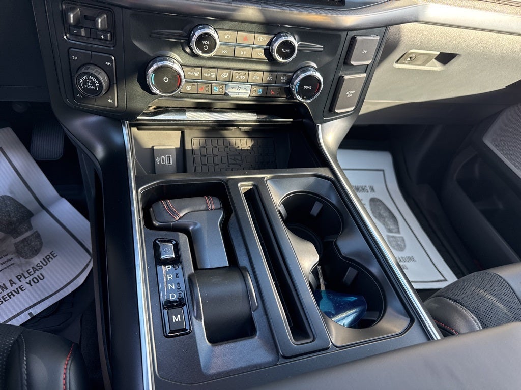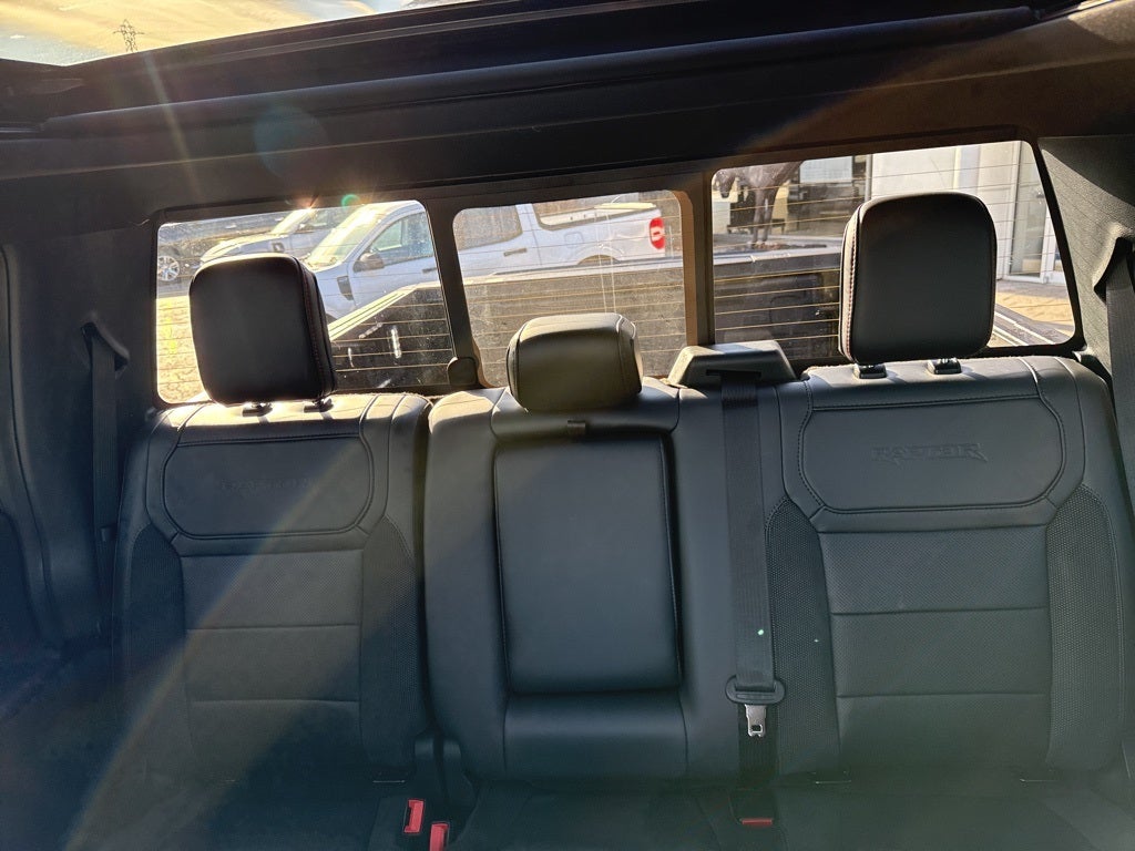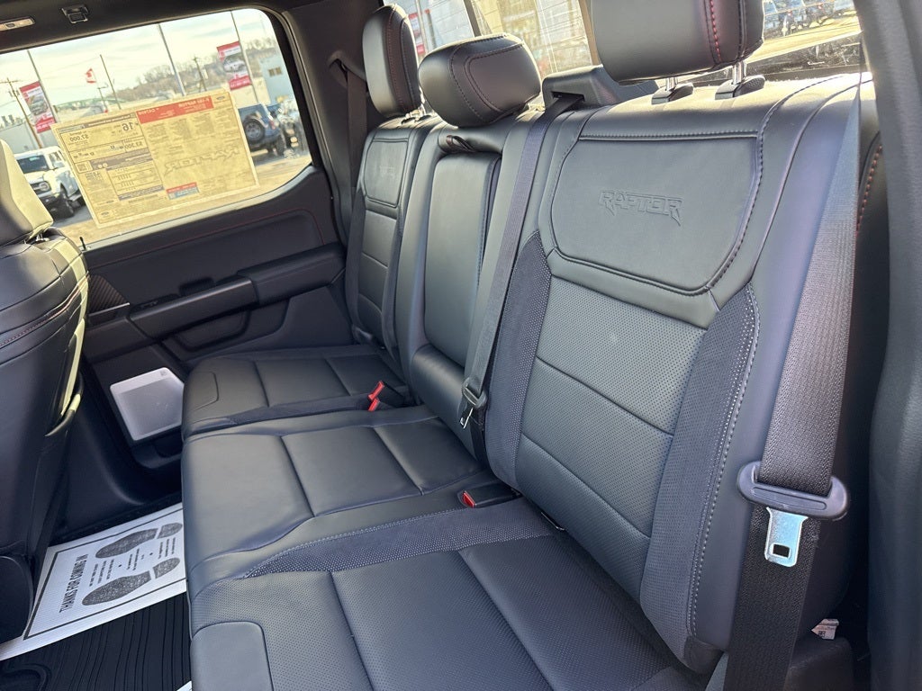 Equipment Group 802A Raptor 37 (Carbon Fiber Interior Appliques, Dual Valve Shocks, Modular Front Bumper, RECARO Alcantara Suede Front Seats, and Wheels: Raptor 37 Unique 17 Cast Aluminum), 14 Speakers, 17 Cast Aluminum Wheels, 4-Wheel Disc Brakes, ABS brakes, Adjustable pedals, Air Conditioning, Alloy wheels, AM/FM radio: SiriusXM with 360L, Auto High-beam Headlights, Auto tilt-away steering wheel, Auto-dimming door mirrors, Auto-dimming Rear-View mirror, Automatic temperature control, Brake assist, Bumpers: body-color, Compass, Delay-off headlights, Driver door bin, Driver vanity mirror, Dual front impact airbags, Dual front side impact airbags, Electronic Locking w/4.10 Axle Ratio, Electronic Stability Control, Emergency communication system: SYNC 4 911 Assist, Front anti-roll bar, Front Bucket Seats, Front Center Armrest, Front dual zone A/C, Front fog lights, Front reading lights, Front wheel independent suspension, Fully automatic headlights, Garage door transmitter, Heads-Up Display, Heated door mirrors, Heated front seats, Heated rear seats, Heated steering wheel, Illuminated entry, Internet access capable: FordPass Connect 5G, Lane Departure Warning System, Leather steering wheel, Leather Trimmed Seats, Low tire pressure warning, Memory seat, Navigation system: Connected Navigation, Occupant sensing airbag, Outside temperature display, Overhead airbag, Overhead console, Panic alarm, Passenger door bin, Passenger vanity mirror, Pedal memory, Power door mirrors, Power driver seat, Power passenger seat, Power steering, Power windows, Radio data system, Radio: B&O Unleashed Sound System by Bang & Olufsen, Rain sensing wipers, Rear reading lights, Rear step bumper, Rear window defroster, Remote keyless entry, Security system, Speed control, Speed-sensing steering, Split folding rear seat, Steering wheel memory, Steering wheel mounted audio controls, SYNC 4 w/Enhanced Voice Recognition, Tachometer, Telescoping steering wheel, Tilt steering wheel, Traction control, Trip computer, Turn signal indicator mirrors, Twin Panel Moonroof, Variably intermittent wipers, and Ventilated front seats.