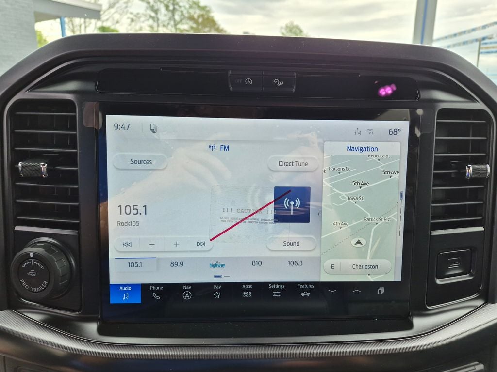 Equipment Group 501A Mid (ActiveX Trimmed Bucket Seats, Illuminated Driver and Passenger Visors, Power-Adjustable Pedals with Memory, Power-Sliding Rear Window, Radio: B&O Sound System by Bang and Olufsen, SYNC 4 with Enhanced Voice Recognition, and Wheels: 20 Chrome-Like PVD), Ford Connectivity Package (1-Year Included), FX4 Off-Road Package (4x4 FX4 Off-Road Bodyside Decal, Hill Descent Control, Monotube Rear Shocks, Off-Road Tuned Front Shock Absorbers, and Tray Style Floor Liner Without Carpet Mats), Internet access capable: 5G Modem - Ford Connectivity Package, Lariat Black Appearance Package (Black Exterior Badging, Black Grille, Black Taillamp Bezels, Body-Color Front and Rear Bumpers, Body-Color Skull Caps and Door Handles, Dark Interior Appliques, and Gray Box Side Decal), Tow/Haul Package (Integrated Trailer Brake Controller), 4-Wheel Disc Brakes, 8 Speakers, ABS brakes, Air Conditioning, Alloy wheels, AM/FM radio: SiriusXM with 360L, Auto High-beam Headlights, Auto-dimming door mirrors, Auto-dimming Rear-View mirror, Automatic temperature control, Brake assist, Bumpers: chrome, Chrome wheels, Compass, Delay-off headlights, Driver door bin, Driver vanity mirror, Dual front impact airbags, Dual front side impact airbags, Electronic Stability Control, Emergency communication system: SYNC 4 911 Assist, Front anti-roll bar, Front Bucket Seats, Front Center Armrest, Front dual zone A/C, Front fog lights, Front reading lights, Front wheel independent suspension, Fully automatic headlights, Garage door transmitter, Heated door mirrors, Heated front seats, Heated steering wheel, Illuminated entry, Low tire pressure warning, Memory seat, Navigation system: Connected Navigation, Occupant sensing airbag, Outside temperature display, Overhead airbag, Overhead console, Panic alarm, Passenger door bin, Passenger vanity mirror, Power door mirrors, Power driver seat, Power passenger seat, Power steering, Power windows, Radio data system, Rain sensing wipers, Rear reading lights, Rear seat center armrest, Rear step bumper, Rear window defroster, Remote keyless entry, Security system, Speed control, Split folding rear seat, Steering wheel mounted audio controls, Tachometer, Telescoping steering wheel, Tilt steering wheel, Tough Bed Spray-in Bedliner, Traction control, Trip computer, Turn signal indicator mirrors, Twin Panel Moonroof, Variably intermittent wipers, Ventilated front seats, and Wheels: 18 Chrome-Like PVD.